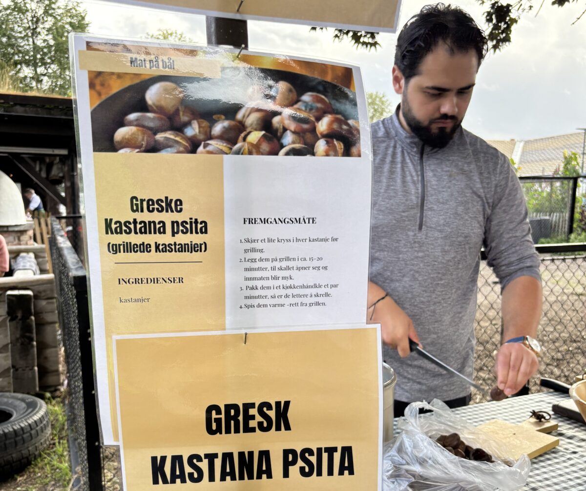 GRESKE KASTANJER grillet på bålet var èn av mange retter som ble servert til besøkende på Kampen Gård.