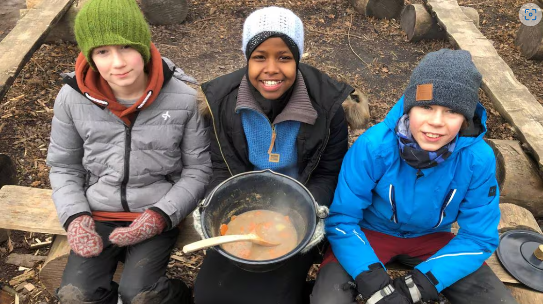 UTESKOLE: Skolebarna i Horten lærte å fyre bål, tilberede mat på bålet og å lage den samiske kjøttgryta bidos. Foto: Harald Inderhaug/NRK