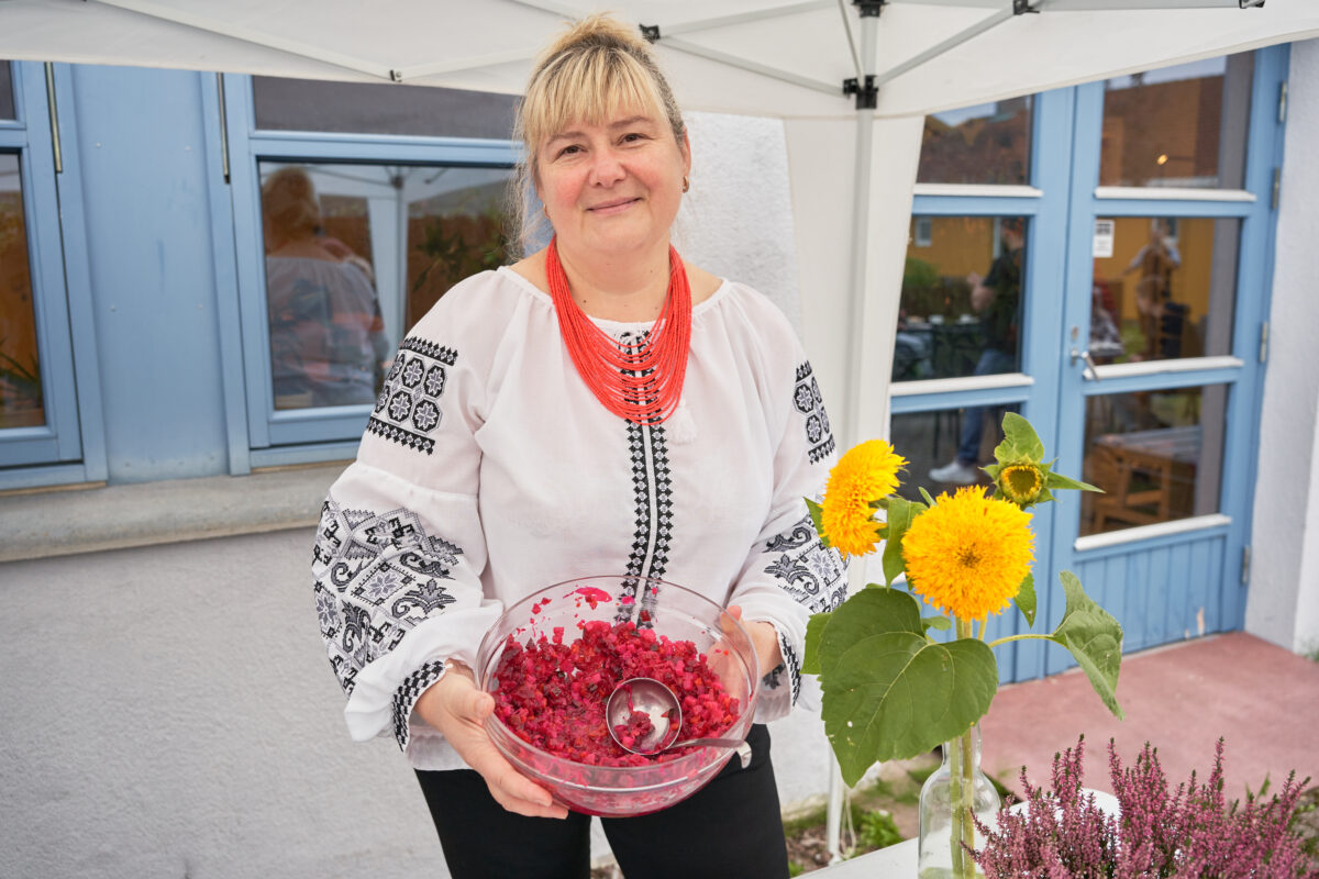 TRADISJONSBÆRER: Svitlana stilte ikke bare med mat, men også i tradisjonelt ukrainsk antrekk; brodert vyshyvanka og det karakteristiske smykket korali.
