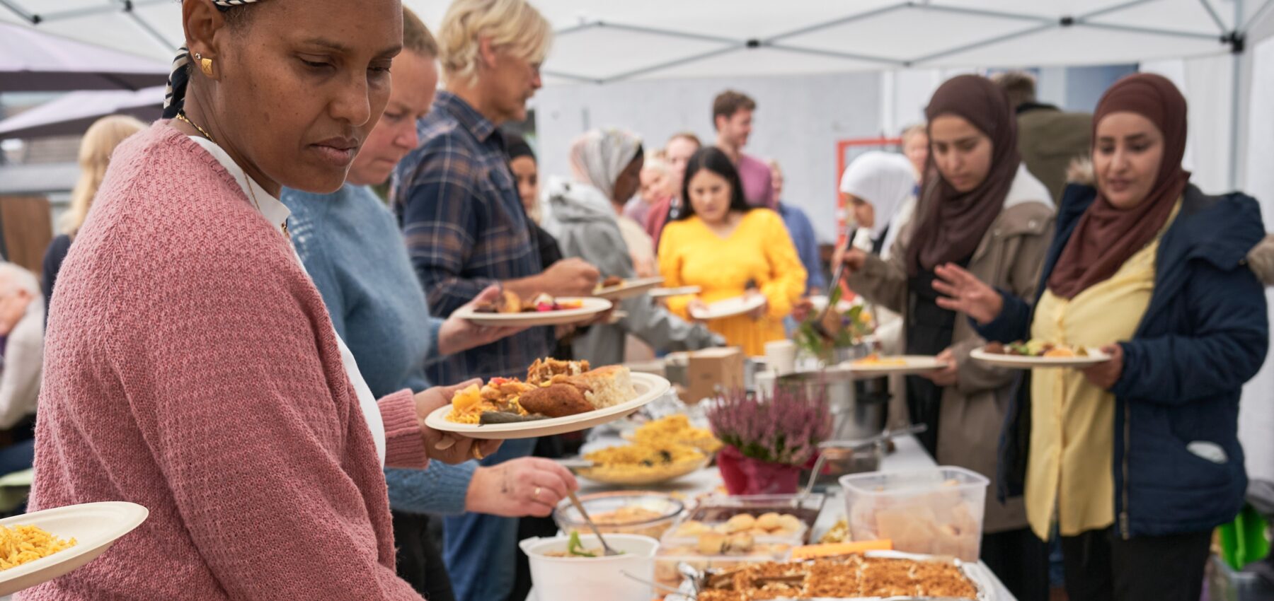 På langbordet stod alt fra afghansk ris med kjøtt, afrikansk maismelgrøt og kassavablader til kurdisk dolma, syriske kibbeh og søte qatif, thailandsk pad mee og ukrainske klassikere som vinagrette, dumplings, zrazy, kjøttpannekaker og honningkake.