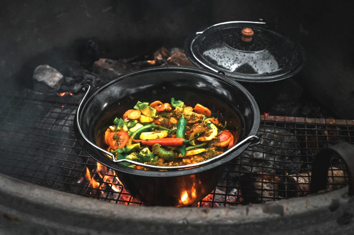 SNART MAT: Amy Mir (fra høyre), Hilde Grøtte og Fouzia Mir sammen med to kvinner som lager biryani på bål.