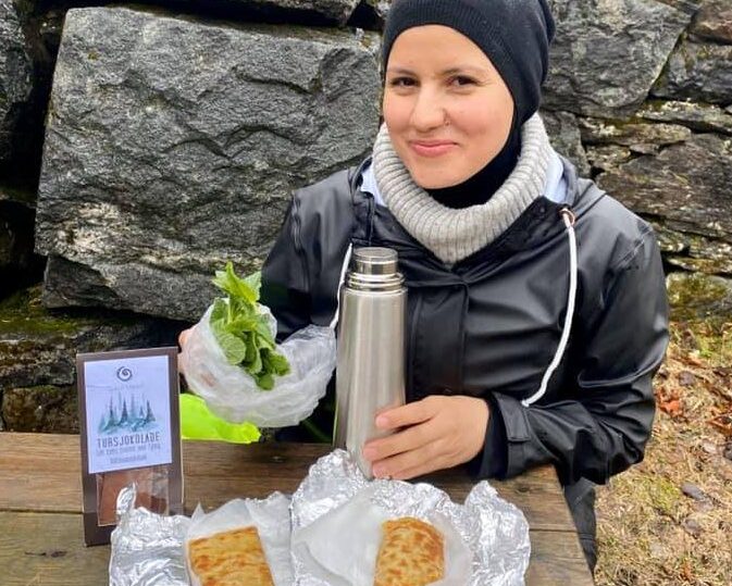 TUROPPLEVELSER: Lamia El Jordari og Hanan Abdelrahman nyter lunsj på tur. Hanan Abdelrahman (t.h.) er mattelærer, høgskolelektor, gründer og forfatter – og elsker å gå tur! Hun og to venninner startet turgruppen Turfølge Oslo og omegn